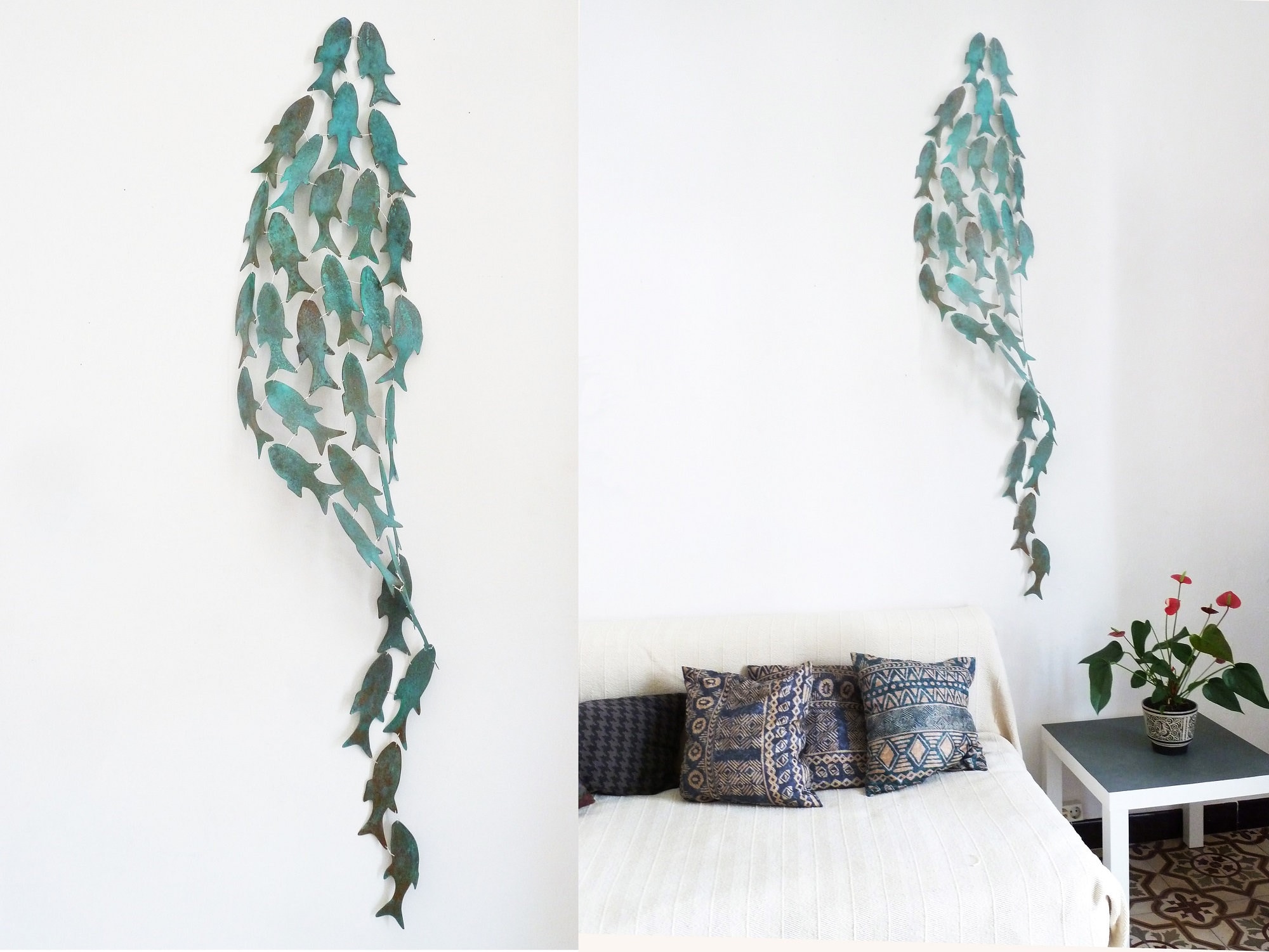 Anne hand sawed all fish of the BLUE SHOAL by hand and then treated them chemically, one by one, to generate the blue oxidizing process which normally would take more than a decade. Afterwards she sealed the fish with a matt sealer. Finally she tied the fish together with silver plated copper wire.